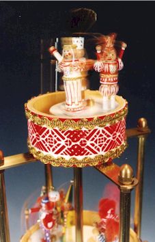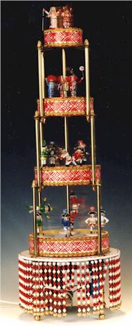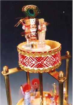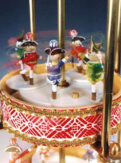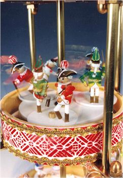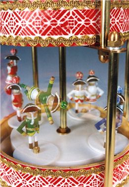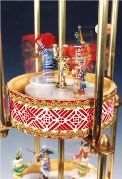 Zwei Clownspäärchen mit Musikinstrumenten (Trumm, Zimm, Teufelsgeige) drehen sich auf der dritten Etage.